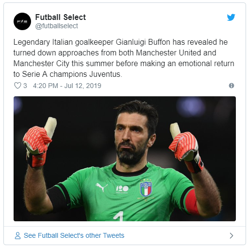 ได้ปฏิเสธย้ายไปร่วมทีม แมนเชสเตอร์ ยูไนเต็ด และ แมนเชสเตอร์ ซิตี้ ตามรายงานของ เดลีย์ เมล์ อย่างไรก็ตามตลอด 1 ซีซั่นในฝรั่งเศส บุฟฟอน เองก็ดูเหมือนจะไม่ประสบความสำเร็จนัก และเมื่อหมดสัญญาก็มีทีมอย่าง ปีศาจแดง และ เรือใบสีฟ้า ติดต่อไป แต่สุดท้ายแล้วก็เป็น ยูเวนตุส ที่ยื่นข้อเสนอให้กับ บุฟฟอน กลับทีมดีกว่าจะไปนั่งเป็นมือสองต่อจาก ดาบิด เด เคอา และ เอแดร์ซอน ส่วนในสัญญาที่ ยูเว่ มอบให้นายทวารวัย 41 ก็คือจะให้ลงสนามอย่างน้อย 10 นัดในฤดูกาลหน้า ซึ่งก็ทำให้ บุฟฟอน ไม่ลังเลในการกลับบ้านหลังนี้มากกว่าการไปทำเงินใน พรีเมียร์ลีก นั่นเอง