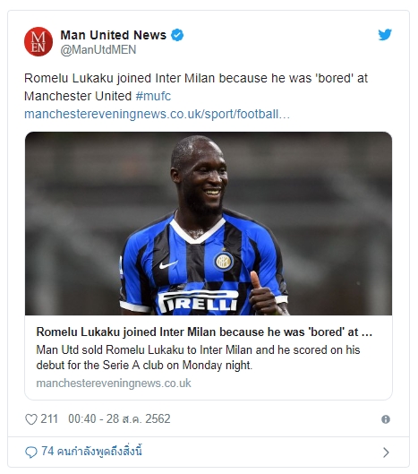 รู้สึกเบื่อเวลาเล่นให้ แมนเชสเตอร์ ยูไนเต็ด แต่หลังจากที่ย้ายมาอยู่กับ อินเตอร์ มิลาน อาการนั้นก็ดีขึ้นจนยิ้มอย่างมีความสุขได้อีกครั้ง ผมมั่นใจว่า โรเมลู ลูกากู ต้องการความท้าทายใหม่ ๆ อย่างถึงที่สุด เพราะหากใครสังเกตออกจะรู้เลยว่าเขารู้สึกเบื่อมากเวลาเล่นให้ แมนฯ ยูไนเต็ด มาร์ตี้ กล่าว และการได้ทำงานร่วมกับคนเก่ง ๆ อย่าง คอนเต้ จะช่วยให้เขากลับคืนสู่ฟอร์มสุดยอดและกลายเป็นคนสำคัญสำหรับโปรเจ็คใหญ่ที่ อินเตอร์ มิลาน กำลังสร้างอยู่ด้วยแน่นอน อย่างที่เรารู้ดีแหละว่าเป้าหมายของพวกเขาคือการก้าวข้าม นาโปลี และ ยูเวนตุส ขึ้นไปคว้าแชมป์กัลโช เซเรียอา ให้ได้อีกครั้ง ไม่มีใครรู้อนาคตหรอกนะว่าพวกเขาจะไปถึงจุดนั้นได้จริงหรือเปล่า แต่ที่แน่ ๆ คือ ลูกากู ของเรากลับมาเล่นฟุตบอลอย่างมีความสุขและรอยยิ้มบนใบหน้าได้อีกครั้งแล้ว
